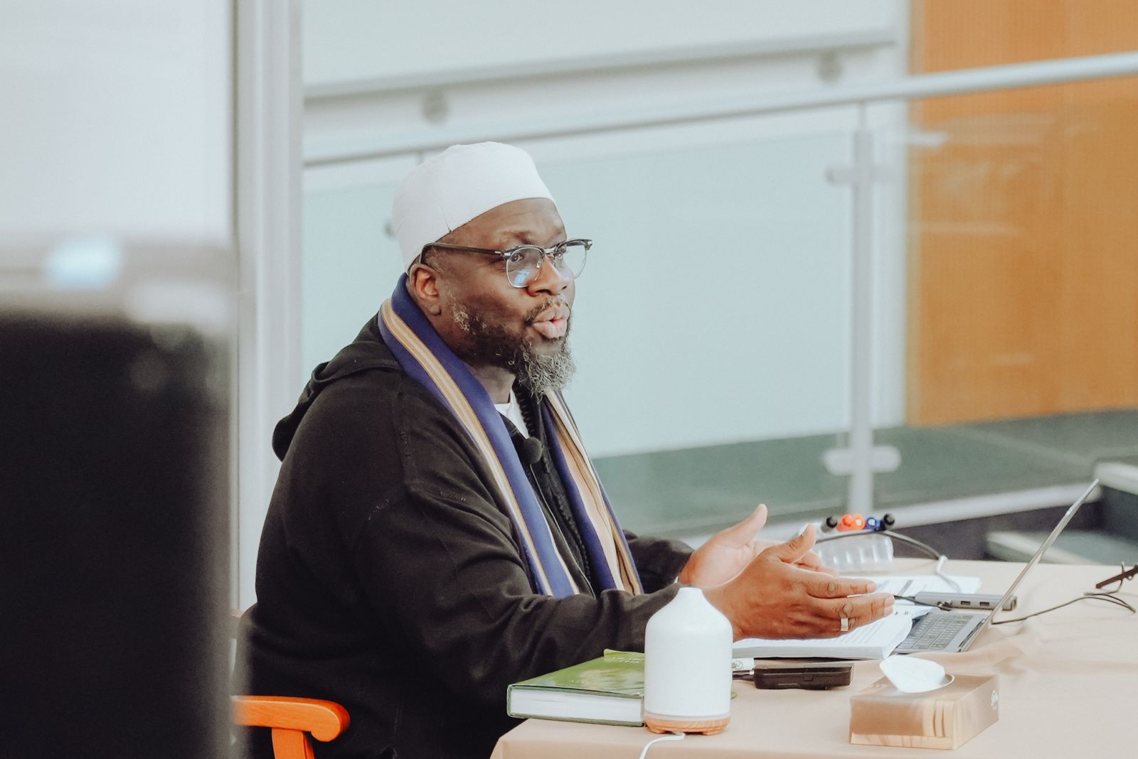 Ustadh Ibrahim was born and raised in Liverpool, England. He studied classical Islamic sciences in Syria and Mauritania at Abu Nur Institute, Damascus University, and the Mahdara of Murabit al-Haj. He later spent over six years in Tarim, Yemen, studying at Dar al-Mustafa and the Ribat of Tarim under scholars including al-Habib Umar b. Hafiz, al-Habib Kazim al-Saqqaf, and al-Habib Ali al-Jifri.
